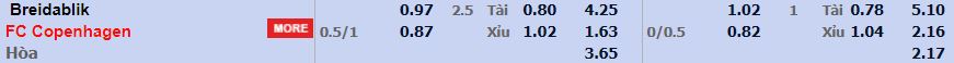 • Mức kèo nhà cái cược chấp trận này: FC Copenhagen chấp 0,75 Trái. Breidablik ăn 0,97. FC Copenhagen ăn 0,87