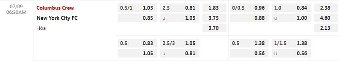• Mức kèo nhà cái cược chấp trận này: Colombus chấp 0,75 trái. Colombus ăn 1,03. New York City ăn 0,85