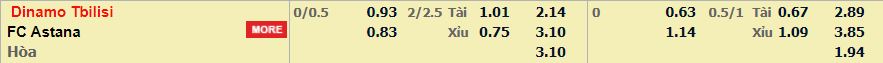 • Mức kèo nhà cái cược chấp trận này: Dinamo Tbilisi chấp 0,25 Trái. Dinamo Tbilisi ăn 0,93. FC Astana ăn 0,83