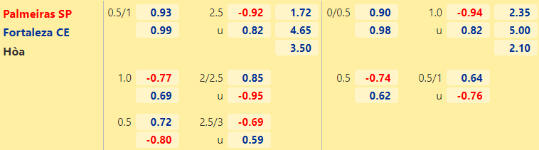 • Mức kèo nhà cái cược chấp trận này: Palmeiras chấp 0,75 Trái. Palmeiras ăn 0,93. Fortaleza ăn 0,99