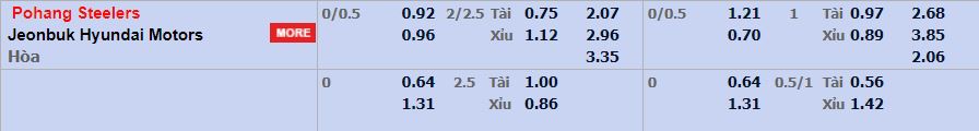 • Mức kèo nhà cái cược chấp trận này: Pohang chấp 0,25 Trái. Pohang ăn 0,92. Jeonbuk ăn 0,96