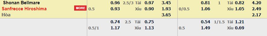 - Mức kèo nhà cái cược chấp trận này: Hiroshima chấp 0,93 Trái. Shonan Bellmare ăn 0,96. Hiroshima ăn 0,93