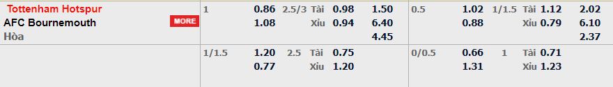 - Mức kèo nhà cái cược chấp trận này: Tottenham chấp 1 Trái. Tottenham ăn 0,86. Bournemouth ăn 1,08