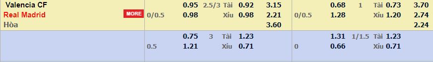 - Mức kèo nhà cái cược chấp trận này: Rea Madrid chấp 0,25 Trái. Valencia ăn 0,95. Real Madrid ăn 0,98