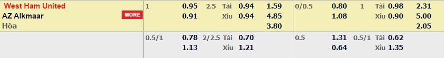 - Mức kèo nhà cái cược chấp trận này: West Ham chấp 1 Trái. West Ham ăn 0,95. AZ ăn 0,91