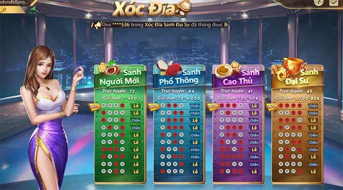 Xóc đĩa 3D có tổng cộng 04 sảnh cược, từ người chơi mới đến cấp cao thủ, đại sư chuyên nghiệp đều có đủ. Người chơi tùy chọn sảnh chơi tương thích với trình độ bản thân, mỗi cấp độ có giới hạn về tiền cược và tiền thưởng.